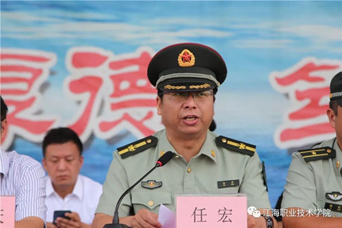 在迎、升国旗和国歌声中,军训总结大会开始。董事长、校长孙永如及校领导华国梁、余如进、陈荣华、吴耕扬、姚滨与承训团首长及学校各院部处领导,在主席台观摩同学们军训成果汇报。