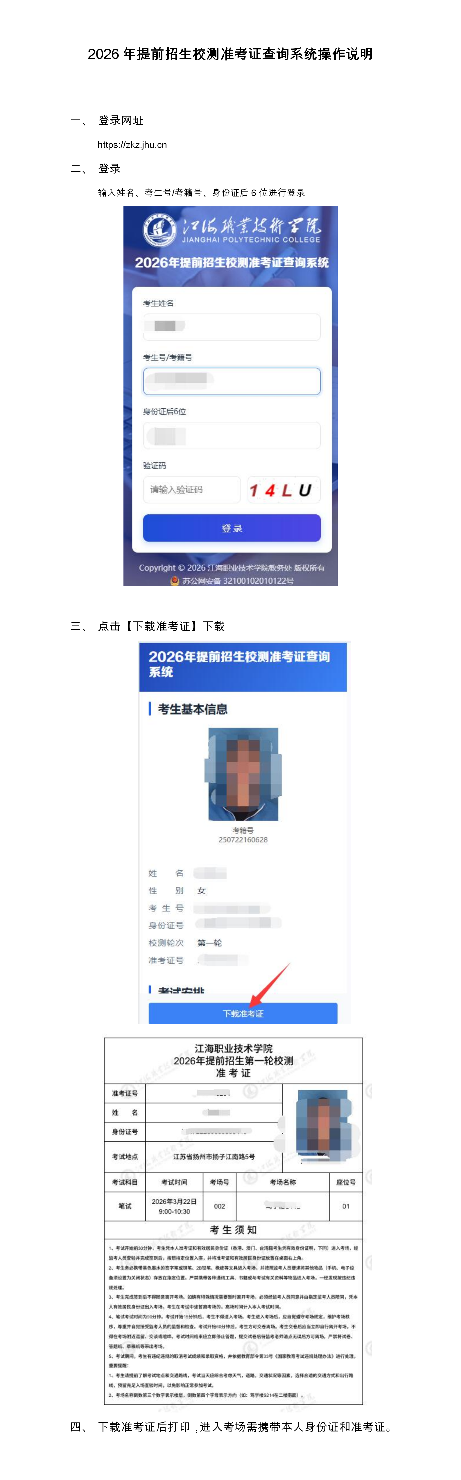 2、2026年提前招生校测准考证查询系统操作说明(见下图)