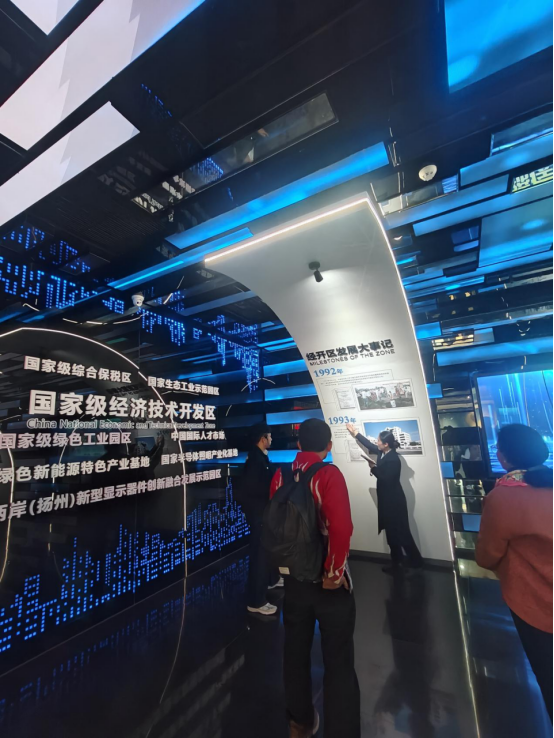来校之前,代表团实地走访了扬州经济技术开发区展示馆。该馆通过图文展板、动态影像及实物模型等形式,系统展示了开发区产业布局、发展成效及规划蓝图,为代表团与我校探讨产教融合合作提供了有益参考。
