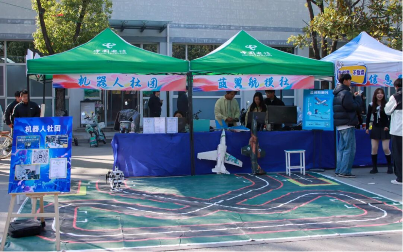 从航模、无人机到手工结艺,从沙盘模拟到新媒体直播,每一个帐篷前都围满了好奇的同学。大家在这里交流想法,展示成果,广场上充满了欢声笑语。